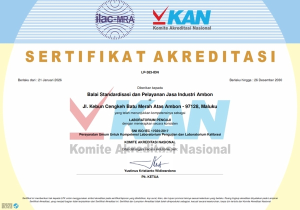 Melalui laboratorium uji yang terakreditasi oleh Komite Akreditasi Nasional sesuai dengan persyaratan standar ISO 17025:2017 dengan Nomor : LP-383-IDN, BSPJI Ambon mempunyai ruang lingkup meliputi : tepung sagu, roti kenari, bagea sagu, biji pala, fuli, minyak kayu putih, ikan asin, ikan asap, teripang kering, sirip cucut kering, cumi-cumi kering, ikan teri asin kering, air minum dalam kemasan, selai buah dan biskuit Laboratorium Uji BSPJI Ambon terdiri atas : Laboratorium Kimia Laboratorium Mikrobiologi dan Instrumen Laboratorium Lingkungan.