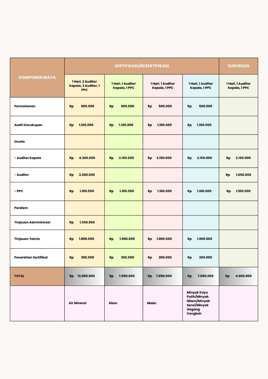 Biaya proses sertifikasi mengacu kepada Peraturan Pemerintah No. 54 Tahun 2021 tentang Jenis dan Tarif atas Jenis PNBP yang berlaku pada Kementerian Perindustrian